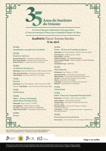 No próximo dia 11 de abril terá lugar a Conferência “25 Anos da transição de Macau para a República Popular da China – 35 Anos do Instituto do Oriente – 45 Anos de Relações Diplomáticas Portugal-China”, no Instituto Superior de Ciências Sociais e Políticas, da Universidade de Lisboa, no âmbito dos 35 Anos do Instituto do Oriente.