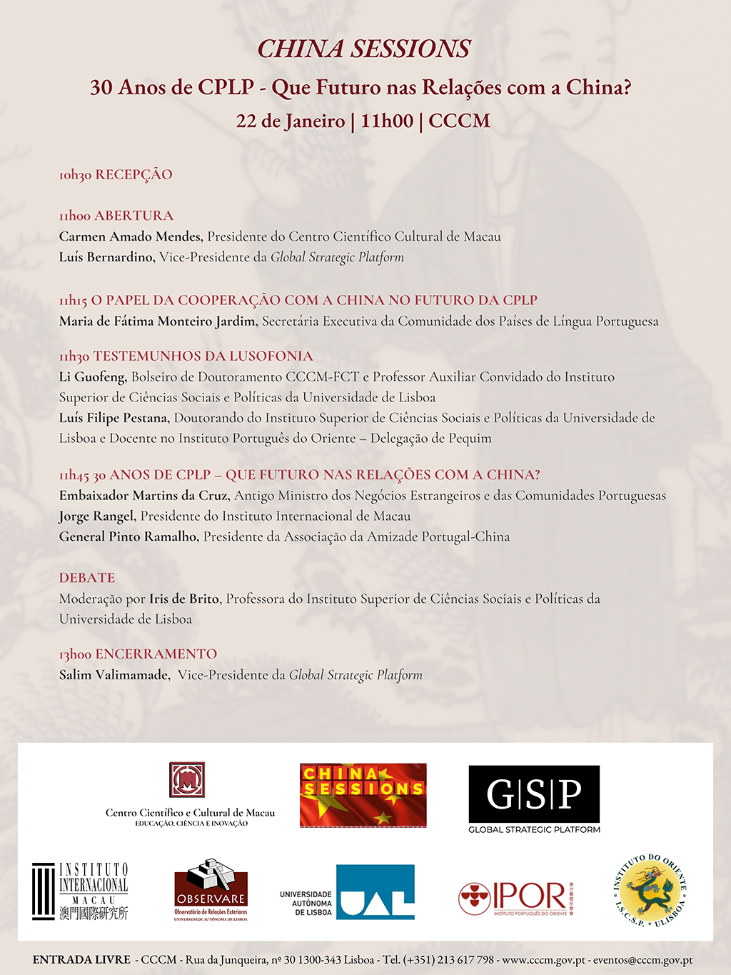 O próximo “China Session”, a realizar-se em 22 de Janeiro de 2026, é um evento organizado em parceria, a partir de Lisboa, pela Global Strategic Platform (GSP) e o Centro Científico e Cultural de Macau (CCCM), e centra-se na análise da relação da Comunidade dos Países de Língua Portuguesa (CPLP) com a República Popular da China (RPC) e a relevância de Macau nesta relação.