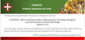 No próximo dia 15 de maio, pelas 17h30, terá lugar no Auditório do CCCM o lançamento de mais dois volumes (Tomos IV e V) da obra “O Afonso – Não é o Henriques, Não é o Albuquerque, é um Homem Português”, Uma Forma de Dizer a História de Portugal, de António Salavessa da Costa.